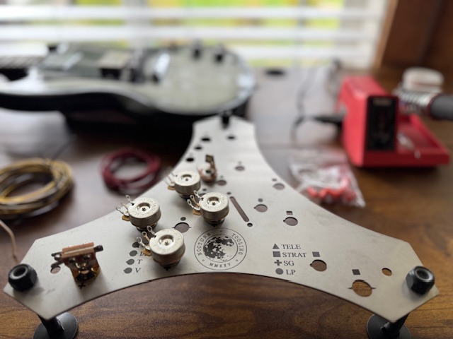 The TT-1 includes prominently marked locations for critical components including input jack, pickup selector switch, and volume and tone potentiometers. Additionally, the workstation is equipped with three-inch adjustable legs, enabling users to tailor the setup to their preferred height. The legs come pre-installed, providing immediate functionality and support for detailed wiring projects.